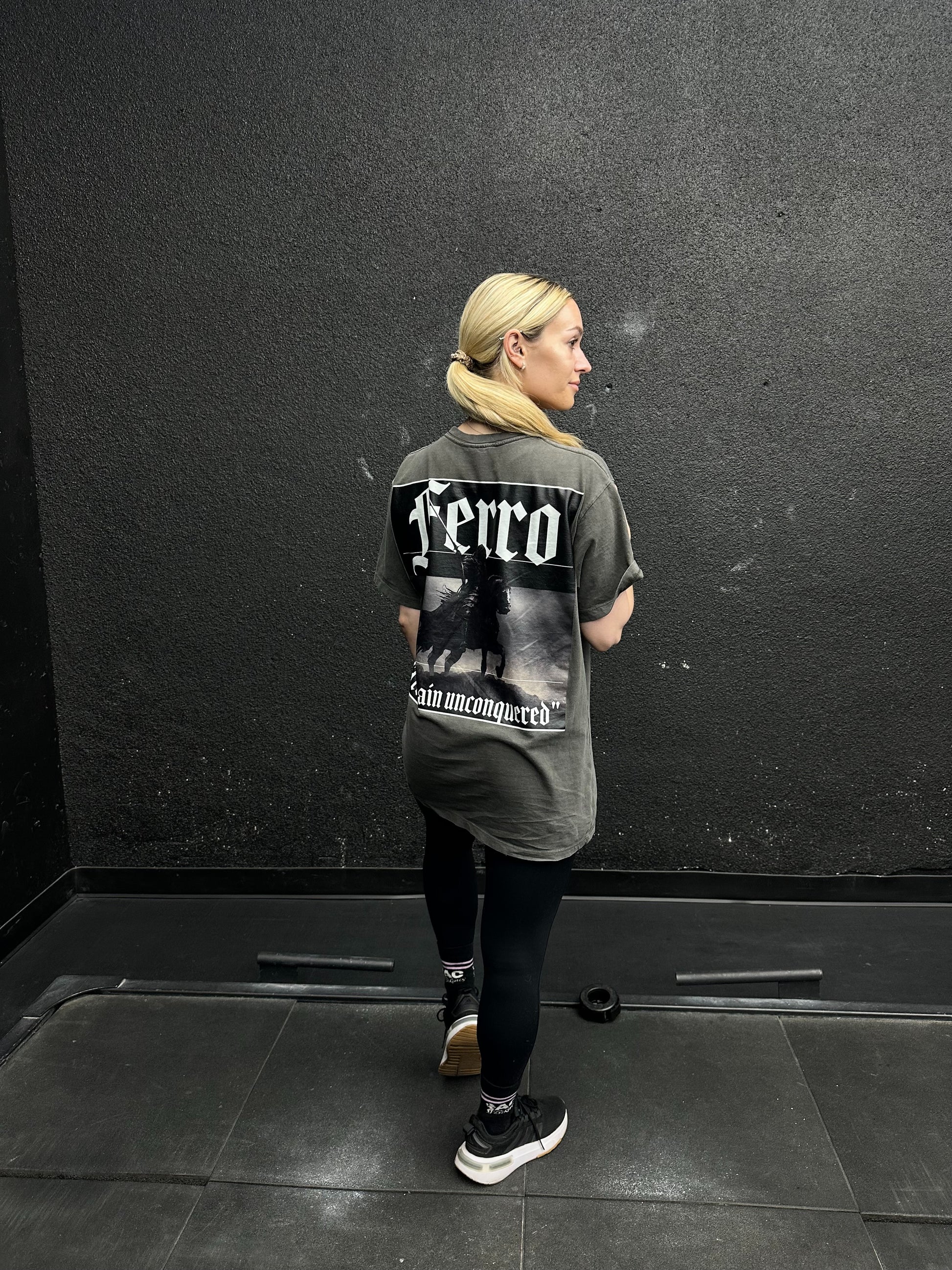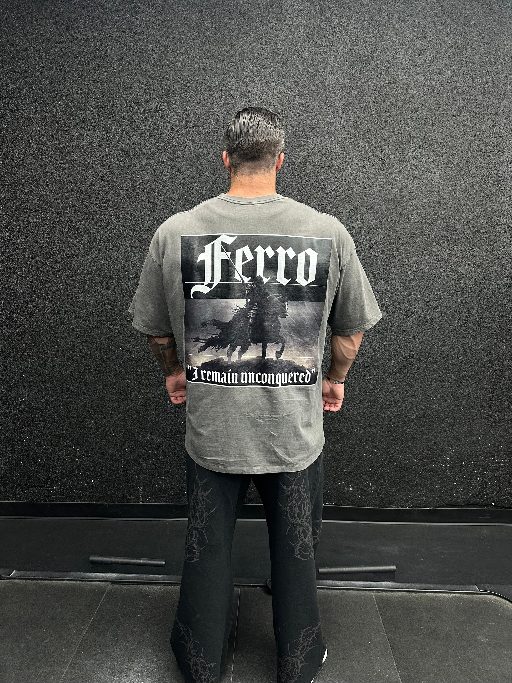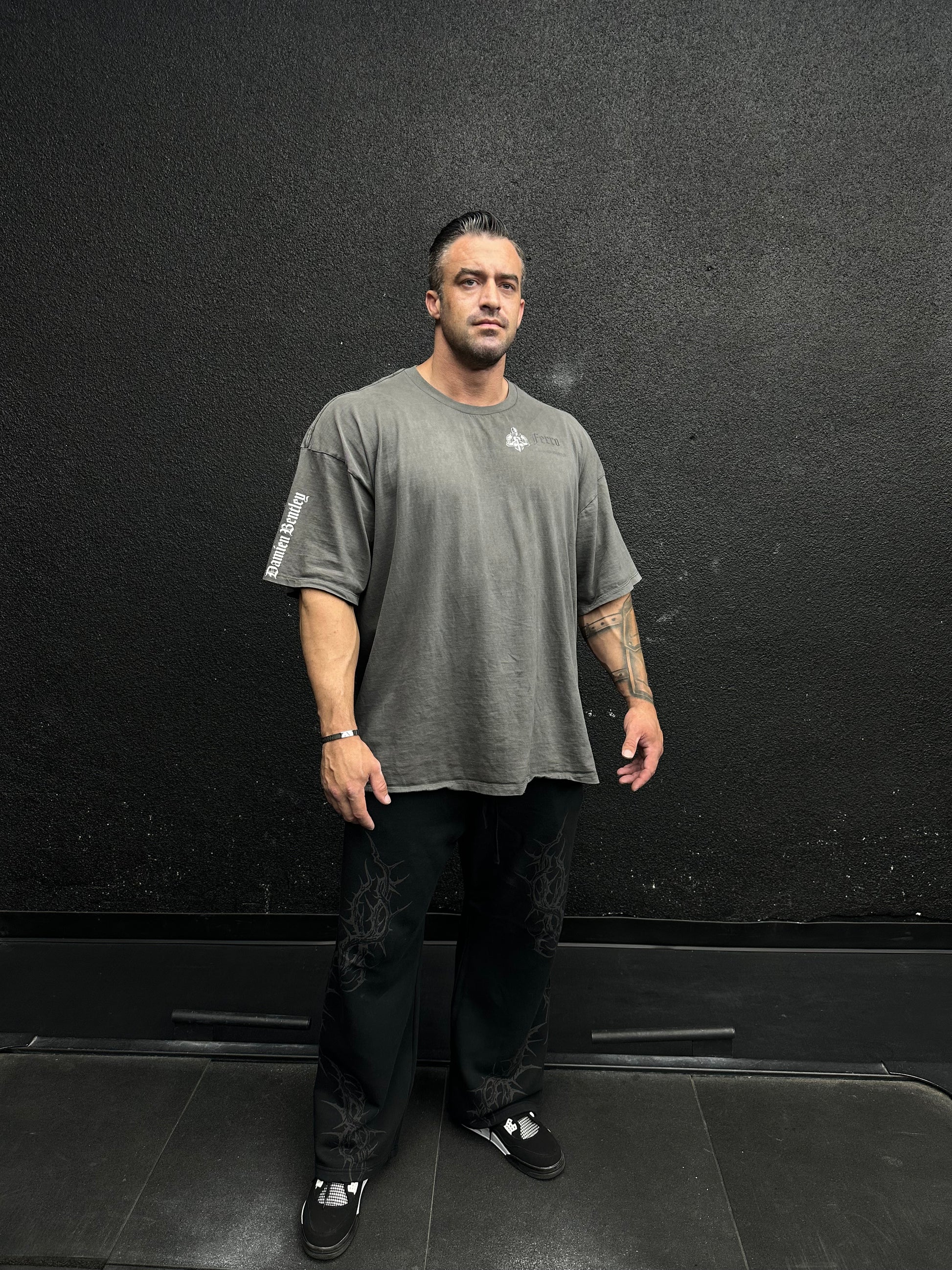 Oversized dark grey shirt with high quality DTF for front logos and DTG for the large back graphics.