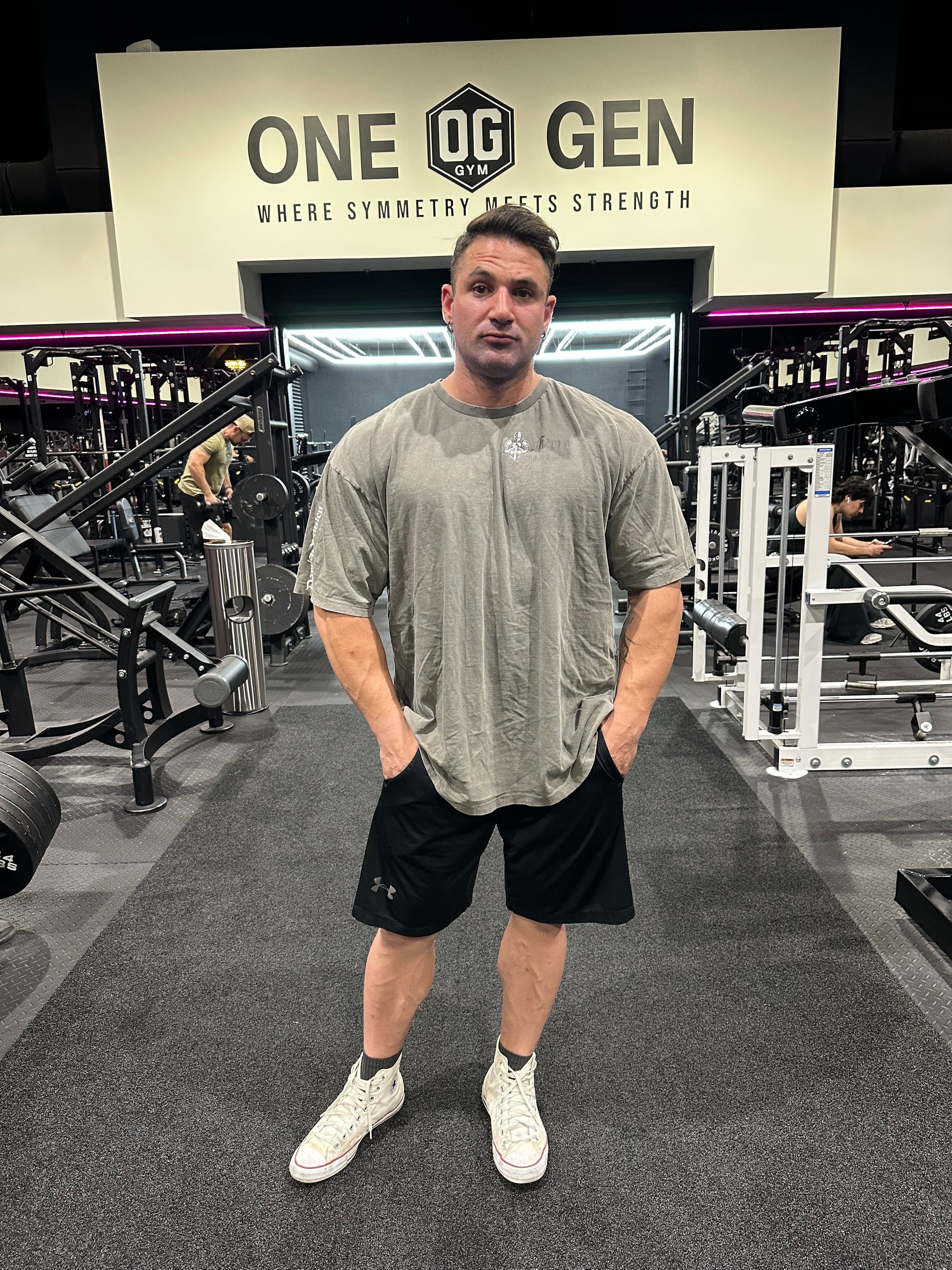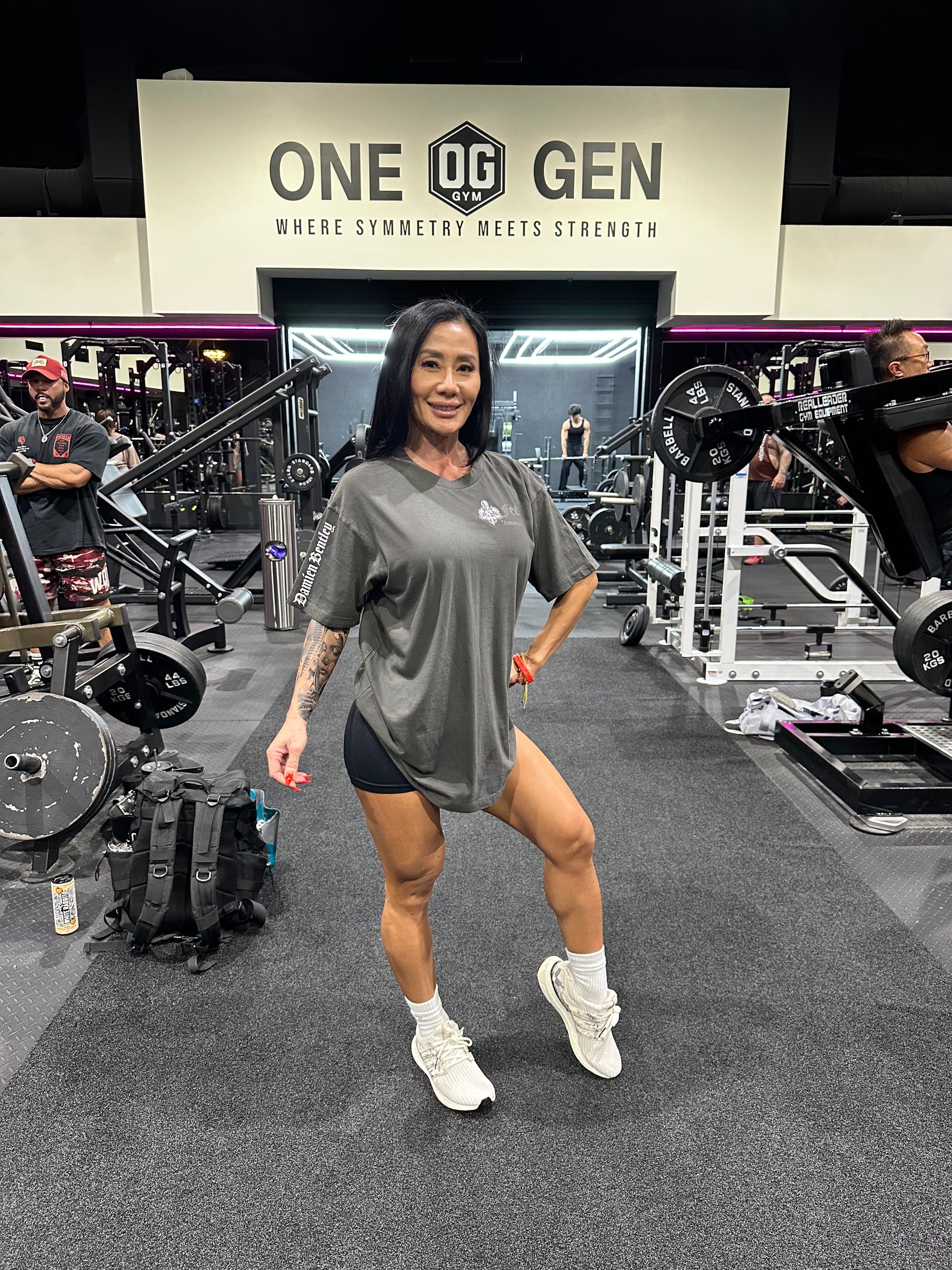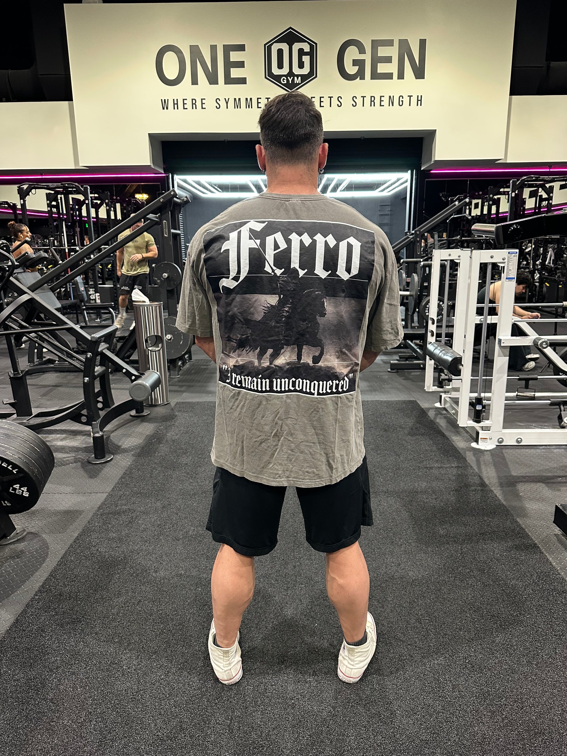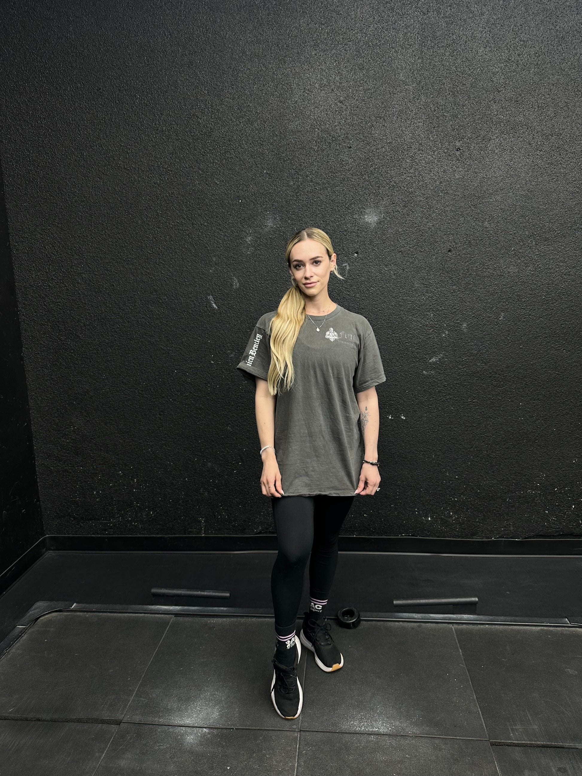 Oversized dark grey shirt with high quality DTF for front logos and DTG for the large back graphics.